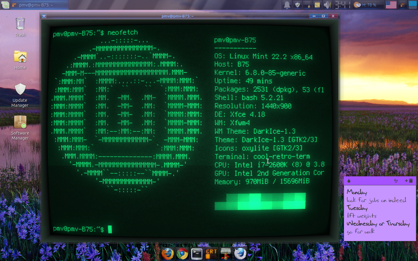 I used an image from this classic shell forum thread for the taskbar background, albeit edited to be more dark to match the rest of the panel. The terminal used is the CRT (Cool Retro Term) I mentioned here. I also added a window switcher button, so it'd be easier to switch workspaces.